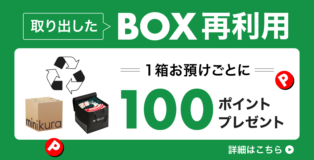 一度利用したボックス・不織布バッグは、再利用が可能です。一箱お預けごとに100ポイントが付与されます。